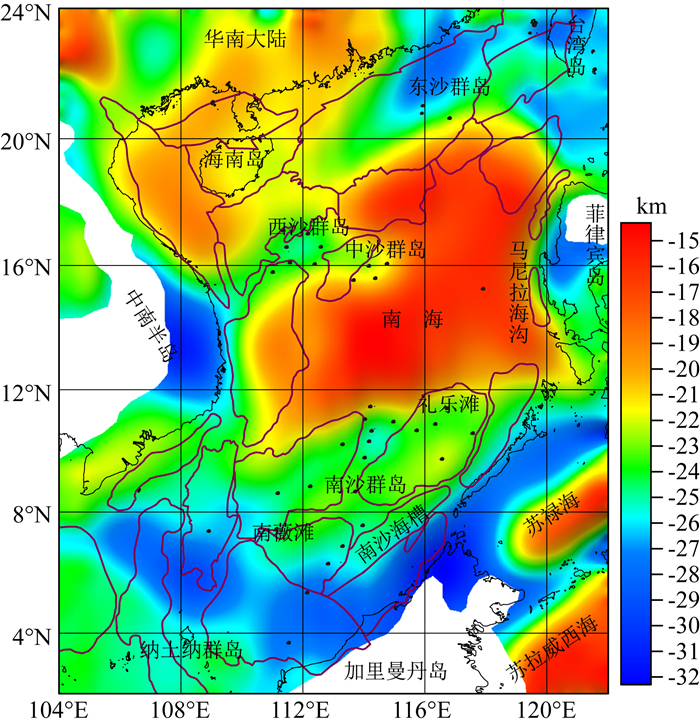 2.2 南海及邻区居里面深度及其分布特征南海及邻区居里面深度(图 7)为15~32 km,其整体表现为“洋壳浅、周缘深”的特征.南海洋盆地区居里面深度在20 km左右,呈“西南浅、东部深”.南海洋盆以北的盆地中,珠江口盆地东北部为NE走向的居里面坳陷带,深度在30 km左右,莺歌海盆地为NW向的居里面隆起带,深度在20 km左右.南海洋盆以南,居里面深度逐渐增大,湄公盆地、万安盆地居里面深度相对较深,深度在24~32 km;纳土纳盆地北部—万安盆地南部—曾母盆地为NW向的居里面坳陷带,深度在26~30 km;南沙群岛附近居里面深度在23~25 km之间变化,其中文莱沙巴盆地—巴拉望盆地南部一带以东南,居里面深度逐渐加深,走向呈NE向,深度在28~31 km.