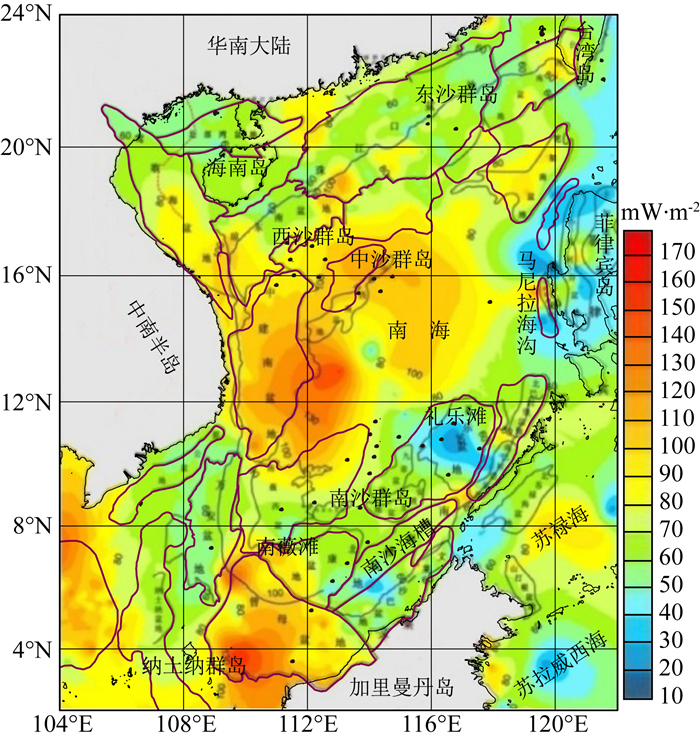 图 8 南海及邻区热流分布图(据胡圣标等,2011) Fig. 8 Heat flow distribution in the South China Sea and adjacent areas (Hu et al., 2011) |