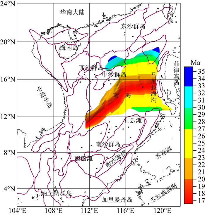 图 9 南海洋壳年龄图(据NGDC,2015) Fig. 9 Ages of ocean crust in the South China Sea (NGDC, 2015) |