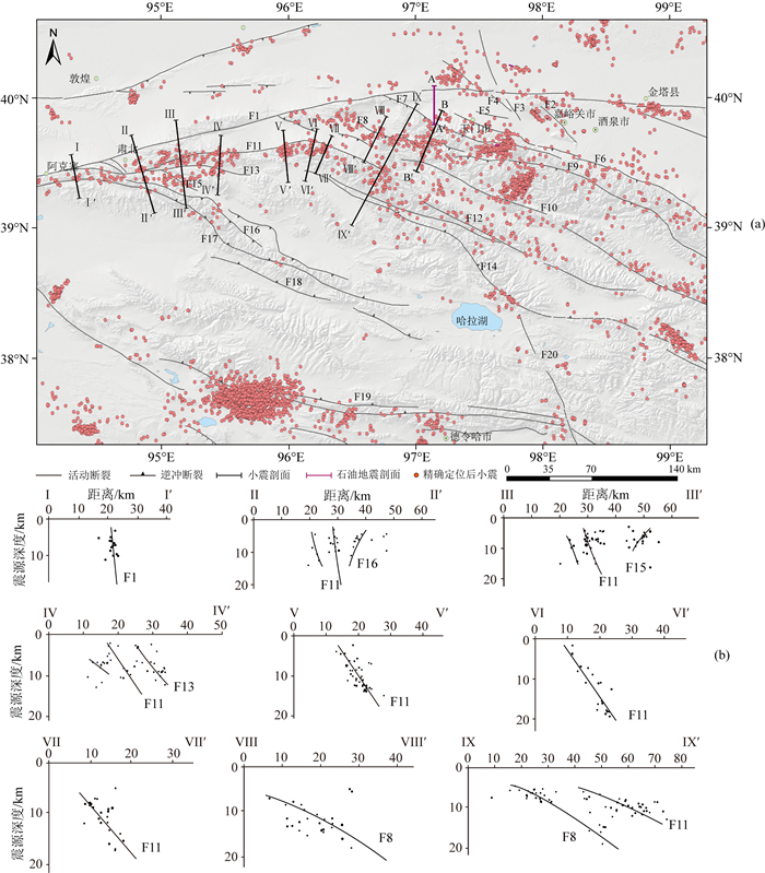 近年来, 地震资料越来越多地应用到活动断裂空间展布、深浅构造分析及动力学机制研究领域(黄媛等,2008;吴建平等,2009;刁桂苓等, 2010;宋美琴等, 2012;房立华等, 2013;Fang et al., 2013, 2014;呼楠和韩竹军, 2013;李红光等, 2015;刘亢等, 2015;李金等, 2016;陈成沟等, 2017).在阿尔金断裂带东段地区,已有学者根据小震信息来开展深部构造方面的研究.张元生等(2004)应用数字化地震台网1996—2002年的微震资料, 反演得到祁连山地区的三维速度图像.王熠熙和张辉(2013)利用祁连山西段2001—2012年间发生的中强地震震源机制解分析了区域应力场特征, 揭示出局部应力场与构造关系紧密.