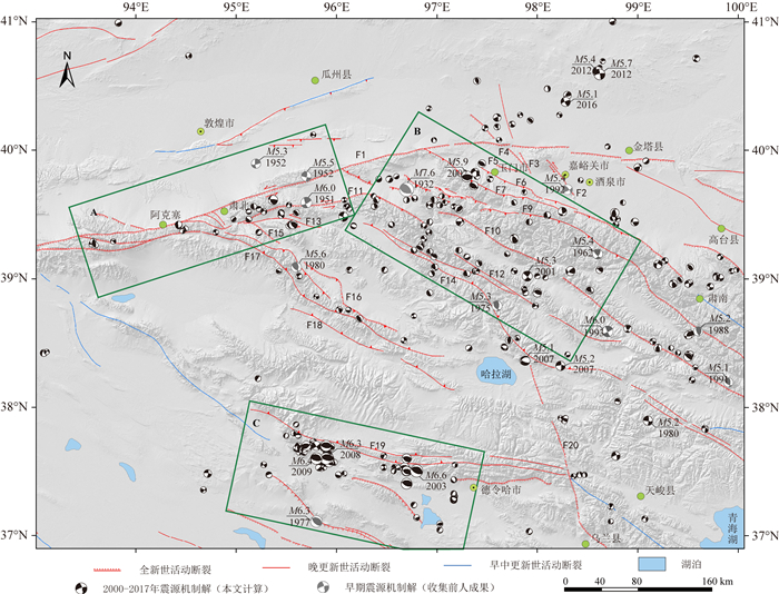 图 1 研究区断裂分布图 F1:阿尔金断裂带;F2:嘉峪关断裂;F3:阴洼山断裂;F4:新民堡断裂;F5:玉门断裂;F6:玉门—冰沟口断裂;F7:旱峡—大黄沟断裂;F8:昌马断裂;F9:肃南—祁连断裂;F10:中祁连北缘断裂;F11:野马河—大雪山断裂;F12:托莱南山断裂;F13:野马河南缘断裂;F14:大雪山—疏勒南山断裂;F15:党河南山北缘断裂;F16:党河南山主峰断裂;F17:党河南山南缘断裂;F18:大哈尔腾河断裂;F19:宗务隆山断裂;F20:乌兰东—鄂拉山—温泉断裂. Fig. 1 Distribution of major active faults in the study area F1: Altyn Tagh fault zone; F2: Jiayuguan fault; F3: Yinwashan fatult; F4: Xinminbao fault; F5: Yumen fault; F6: Yumen-Binggoukou fault; F7: Hanxia-Dahuanggou fault; F8: Changma fault; F9: Sunan-Qilian fault; F10: the northern margin of middle Qilian fault; F11: Yemahe-Daxueshan fault; F12: Tuolainanshan fault; F13: the southern margin of Yemahe fault; F14: Daxueshan-Shulenanshan fault; F15: the northern margin of Danghenanshan fault; F16: the main peak of Danghenanshan fault; F17: the southern margin of Danghenanshan fault; F18: Dahaertenghe fault; F19: Zongwulongshan fault; F20: Wulandong-Elashan- Wenquan fault. |
