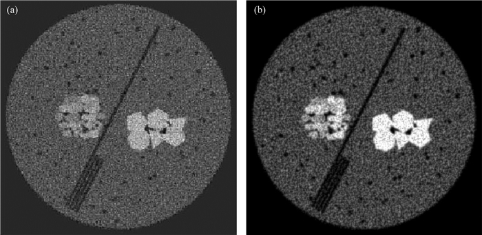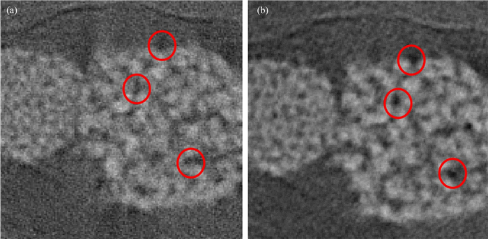 图 15 页岩实际样本的FBP算法(a)和算法2(b)的处理结果 Fig. 15 The results obtained by FBP (a) and algorithm 2 (b) with the practical data |