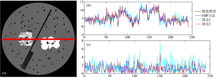 以下几张图反映了图片不同像素条的具体数值情况,以图 10为例,对FBP,算法1和算法2在中间第62行的计算结果进行抽取,可绘制如图 10(b, c),图b中黑色线为数值模型的真实值,蓝色为FBP算法的计算结果,青绿色为算法1的计算结果,红色为算法2的计算结果.图c为不同算法的结果与真实值差的绝对值对比,其中蓝色为FBP算法的计算结果,青绿色为算法1的计算结果,红色为算法2的计算结果,不难看出,红色线相对被蓝色线所包络,可以较好的展示采用算法2后解的稳定性.