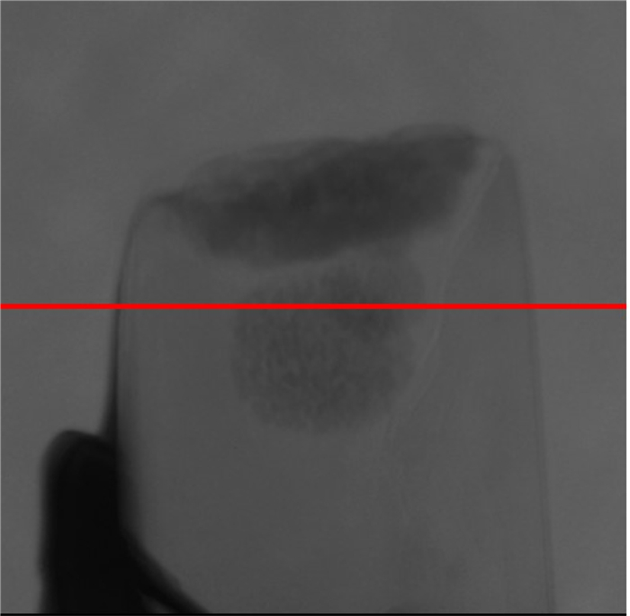 重庆漆辽剖面地理上位于重庆市石柱县六塘乡漆辽村,区域构造上属于四川盆地东缘石柱复向斜带,出露地层有上奥陶统临湘组、五峰组、观音桥组和下志留统龙马溪组.本实验所用页岩样本为龙马溪组页岩样本(本样本由中国科学院先导专项项目组提供).纳米CT吸收数据的实验试场约15 μm,每一个像素为50 nm,经过同步辐射光扫描投影,获取了180组不同角度下的投影数据,图 14为在某一角度下投影的实际数据,其中红线代表以下将以这一行的数据为例,利用180幅投影数据进行成像.