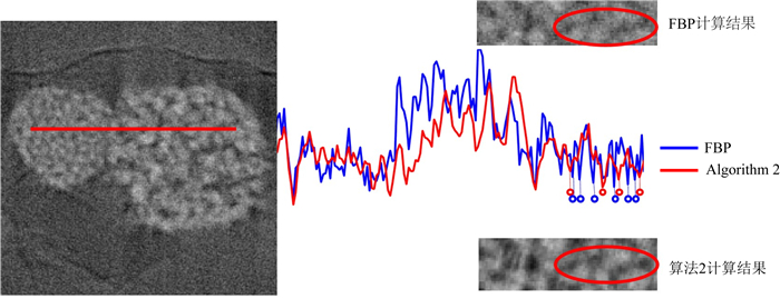 展示孔隙细节如图 17所示,曲线右侧上面为FBP计算结果,下面为算法2计算结果,仔细观察这两种算法在计算结果上均可以发现红色圈注处的4个低吸收像素群所表示的孔隙.但从其中一条测线的数值结果,红色线有明显的4个低吸收位置点(图中以小红圈显示)分别对应着图像上的孔隙,但FBP结果(蓝色)中可以观察到多个低吸收位置点,这是FBP算法的误差导致的,如果利用数值计算孔隙时候,这种高频的低吸收位置可能会被误处理为孔隙,进而造成孔隙度计算的误差,而算法2就不存在这样的问题.