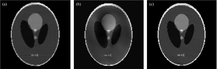 图 3 无噪声情况下不同方法的计算结果 (a) FBP方法计算结果;(b)算法1计算结果;(c)算法2计算结果. Fig. 3 The solution obtained by different method in noiseless case FBP(a), algorithm 1(b), algorithm 2(c). |