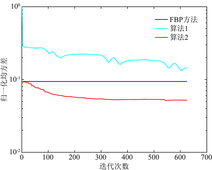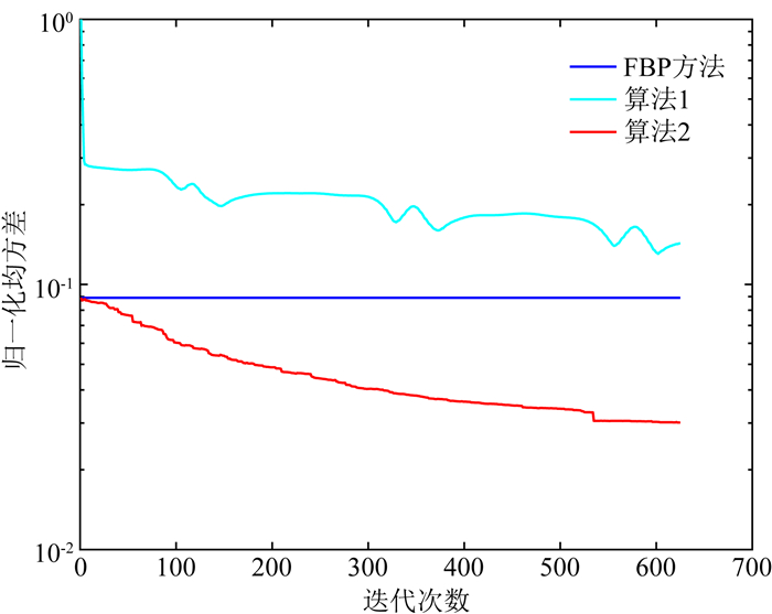 图 4给出了无噪声情况下归一化均方差随每百次迭代次数变化情况.从归一化均方差上看,算法1收敛速度较慢,从图 3b上看存在区域性的伪影,FBP算法在左下角有亮条和暗条的伪影(图 3a),这些现象都没有在算法2的计算结果(图 3c)中观察到,算法2的结果除了残差较低外,图像显示上效果上也较好,与模型基本一致.