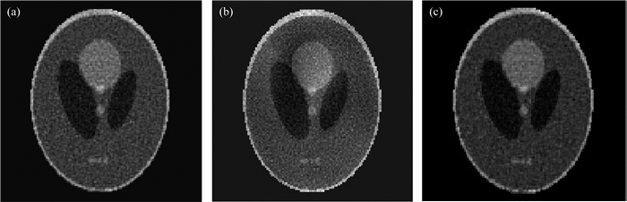 图 5 有噪声情况下不同方法的计算结果 (a) FBP方法计算结果; (b)算法1计算结果; (c)算法2计算结果. Fig. 5 The solution obtained by different method in noisy case (a) FBP; (b) Algorithm 1; (c) Algorithm 2. |