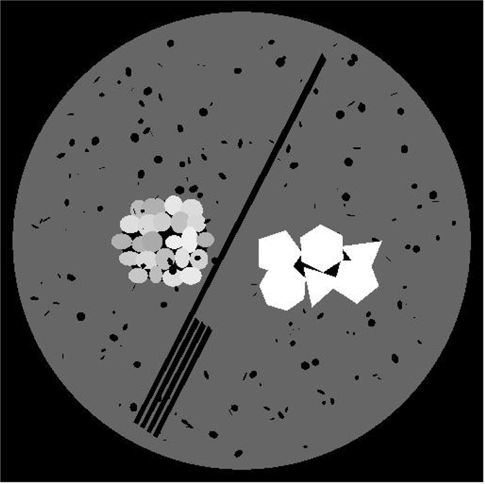 一般地,黄铁矿在大部分光强下吸收系数都远高于石英、白云石等,在成像过程中这些高吸收的样品可能会对周围的像素点造成影响,为了更好地模拟实际数据,本文参照页岩基本成分的吸收系数和孔隙分布的实际情况构造了新的数值模型.在新的模型中,考虑到了可能的狭缝形、椭圆形、三角形、多边形以及高吸收的无规则黄铁矿晶间孔等各种情况,构建了如图 7所示的模型.