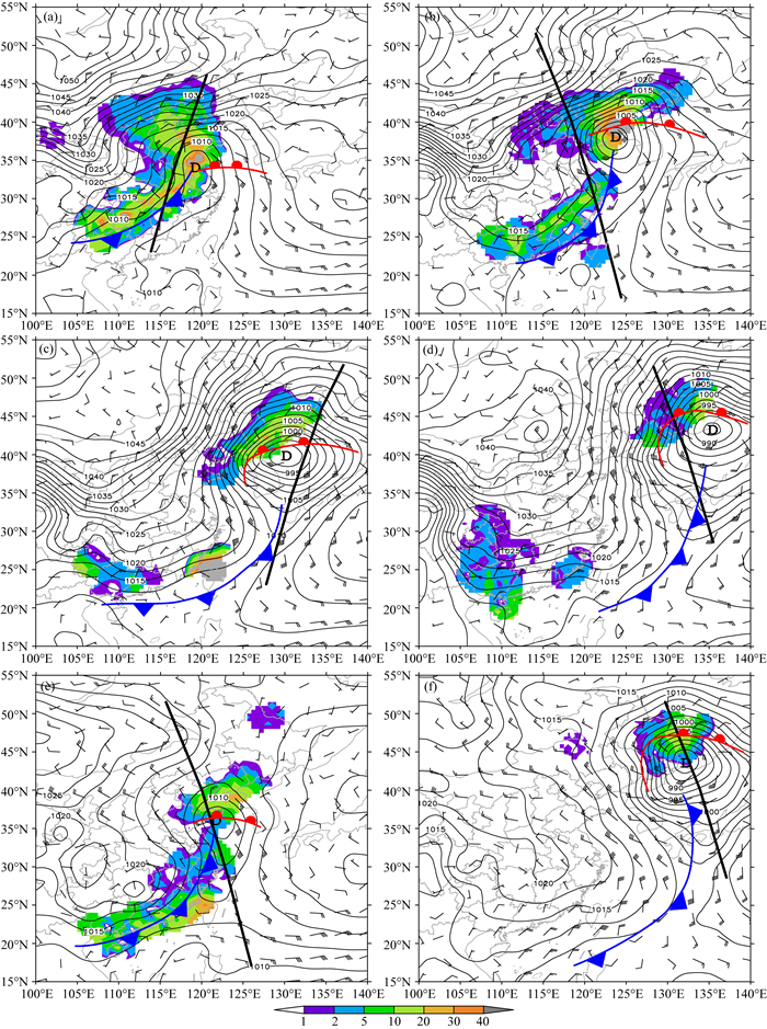图 2 2007年3月3日18时(a)、2007年3月4日06时(b)、2007年3月4日18时(c)、2007年3月5日06时(d)、2013年11月24日06时(e)和2013年11月25日06时(f)海平面气压(黑色实线,单位:hPa)、风(风向杆,单位:m·s-1)、过去6 h降水(填色,单位:mm)及地面气旋中心D和冷、暖锋(黑色加粗线为CloudSat卫星轨迹线) Fig. 2 Sea level pressure field (black lines, hPa), wind (barb, m·s-1), 6h precipitation, the surface low pressure center and fronts at 1800UTC 3 Mar 2007 (a), 0600UTC 4 Mar 2007 (b), 1800UTC 4 Mar 2007 (c), 0600UTC 5 Mar 2007 (d), 0600UTC 24 Nov 2013 (e) and 0600UTC 25 Nov 2013 (f) (Black thick lines are CloudSat ground track) |
