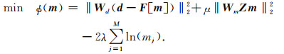 其中Wd为对角数据加权矩阵,其第i个对角元素为第i个观测数据的噪声标准差的倒数.ϕm(m)为模型目标函数项,其体积分形式如下: