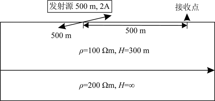 图 1为设计的地电模型,为两层水平模型,地层分界面深度为300 m,上层电阻率为100 Ωm, 下层电阻率为200 Ωm,发射源长度500 m,发射电流2 A,接收点位于垂直轴向距发射源中心点1000 m.
