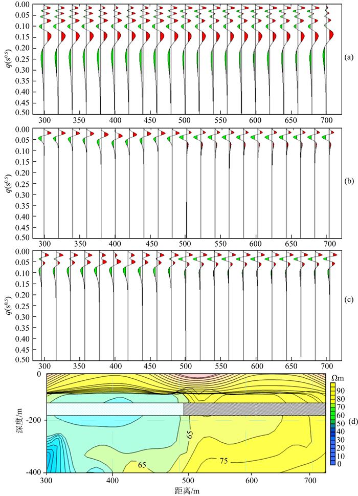 图 5为虚拟波场转换剖面和已知测区视电阻率等值剖面对比图, 图 5(a—c)中红色部分表示正值,绿色部分表示负值.图 5a表示由传统奇异值法计算的虚拟波场剖面, 由于传统奇异值法计算的不完备, 不仅出现很多附加场信息, 同时对采空区的反映不够明显, 图 5b表示采用截断奇异值法计算的虚拟波场剖面, 图像质量已有改善, 但是, 对于采空区与未采区的分界仍不够明显, 图 5c表示采用本文所述修正奇异值法计算结果, 在500号测点附近采空区分界面比较明显, 图 5d表示已知测区实测视电阻率等值线断面图.