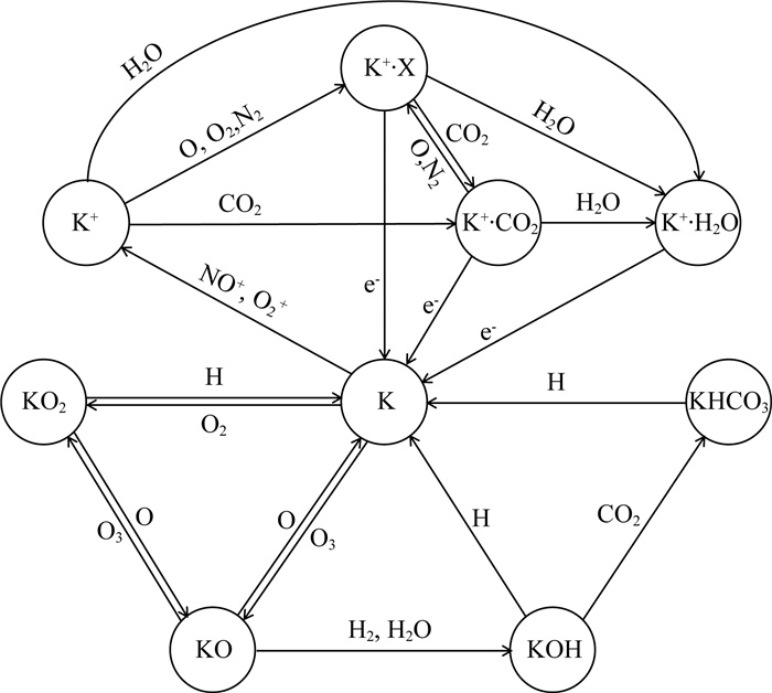 图 1 钾层静态模型中各含钾成分之间的化学反应 Fig. 1 Schematic diagram of potassium chemistry in the model |