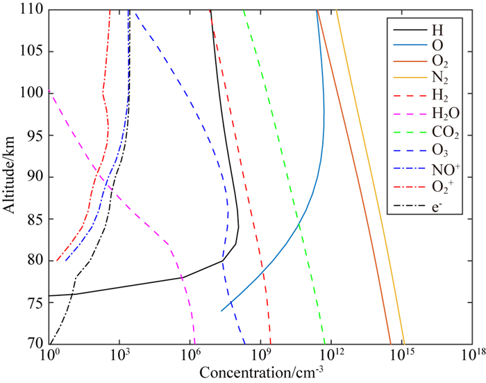 在钾层静态模型的化学部分中, 含钾成分与大气中的H、O、O2、O3、H2O、H2、CO2、N2、NO+、O2+、e- 11种成分发生反应, 故需要提供这11种大气成分的浓度随高度变化曲线.由于实测数据很难满足要求, 所以我们采用大气模型的输出结果.利用NRLMSISE-00大气模型获取H、O、O2、N2的数据, 利用WACCM获取H2、H2O、CO2、O3的数据, 以及利用IRI-2007(International Reference Ionosphere)模型获取NO+、O2+、e-的数据, 其结果如图 2所示.此外, 各种含钾成分之间互相转化的化学反应速率可以参考Plane等(2014)的文献中的表 1.