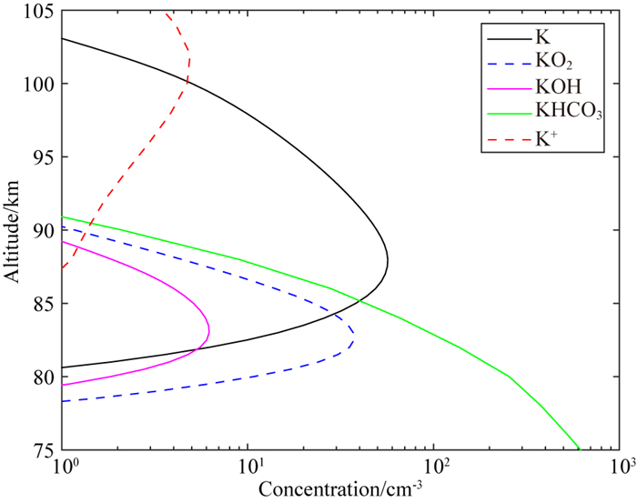 在90 km以下的区域内, 钾原子的浓度随高度的降低而减小, KHCO3的浓度则迅速增加.特别是在85 km以下, KHCO3成为最主要的含钾成分.此外, 在钾层的下部还含有一定的KO2和少量的KOH.在更低的高度下, 所有的含钾成分均转化成KHCO3, 并随着大气运动沉降到低层大气中.