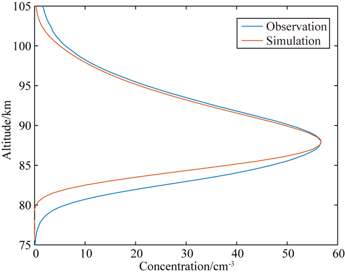 如表 2所示, 将钾层静态模型的模拟结果和北京上空夜间年平均观测数据进行详细的比较.峰值密度的模拟值与观测值最接近, 每立方厘米只相差0.1个钾原子.模拟的柱密度和RMS宽度比观测值分别小了1.0×107 cm-2和0.6 km, 而质心高度却比观测值大了0.6 km.从相对差值的角度来分析, 峰值密度和质心高度的模拟结果与观测仅相差0.2%和0.7%, 但在柱密度和RMS宽度两方面却相差了14.9%和12.5%, 仍然存在较大的提升空间.