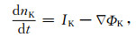 动力学部分, 总含钾成分数密度nK满足连续方程: