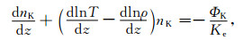其中IK是由流星烧蚀所产生的总含钾成分的注入速率, ΦK是总含钾成分的垂直扩散通量.在长时间平均的条件下, 方程(1)两边均等于零, 则: