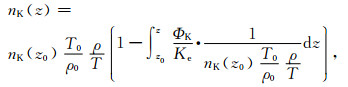 中层顶区域的大气中主要的含钾成分有K、KO、KO2、KOH、KHCO3、K+、K+·O、K+·O2、K+·N2、K+·CO2、K+·H2O 11种物质, 对于每一种含钾成分均受到相同的涡旋扩散作用.假设不同高度处的化学反应达到平衡时的时间尺度远小于垂直输送达到平衡的时间尺度.则总含钾成分的垂直扩散通量满足涡旋扩散方程(Eska et al., 1999):