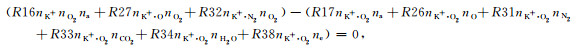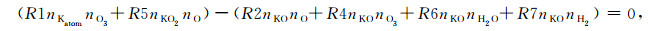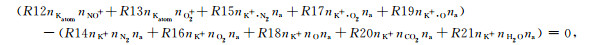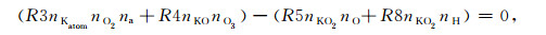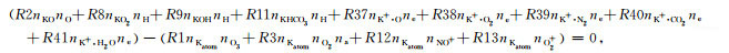 其中Rx是表 1中第x个化学反应的反应速率, x表示化学反应的序号; nW表示W的数密度, W表示参与反应的物质.需要指出的是nKatom为钾原子的数密度, ne是电子e-的数密度.