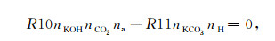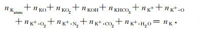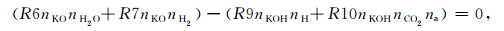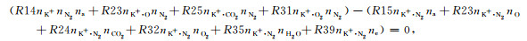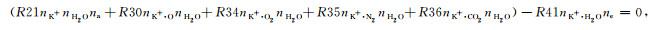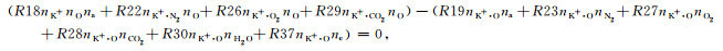 若将以上11个化学平衡方程相加求和, 则可得到恒等式0=0, 故这11个方程是线性相关的, 存在无穷多个非零解.又因为钾层静态模型中的化学反应是闭合的, 既不产生也不消耗总含钾成分, 所以从11个线性相关的方程组中任意选取10个, 再结合动力学部分得到的总含钾成分数密度nK, 可列出: