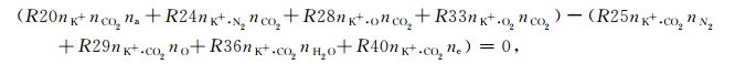 在90km以上的区域内, 钾原子的浓度随高度的增加而降低, 同时钾离子的浓度逐渐升高.在此区域内除了含有K+以外, 还有K+·O、K+·O2、K+·N2、K+·CO2、K+·H2O等多种离子, 但其含量很低, 故没有在图 3中表示出来.虽然这些离子的浓度很低, 但却在复杂的化学反应中起到了重要的作用, 是K+转化成K的过程中不可或缺的中间产物.其过程为