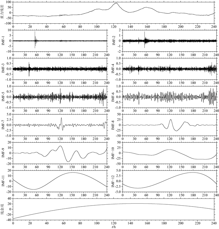 图 1 法国Strasbourg台站在平静期的重力残差及其EEMD分解结果 数据长度为10天,纵坐标单位均为nm·s-2. Fig. 1 Gravity residuals and its decomposing results based on EEMD during quiet period at Strasbourg in France Data length is 10 days, and the unit of vertical axis is nm·s-2. |