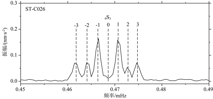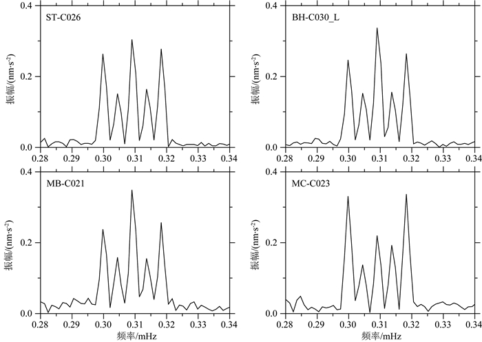 0S2是周期最长的自由振荡信号,其振荡频率相对最为接近地球的自转频率,因而0S2的分裂最为明显.图 9给出了利用4个台站的IMF-5得到的振幅谱,结果显示单独一个IMF就能得到全部的分裂谱峰.