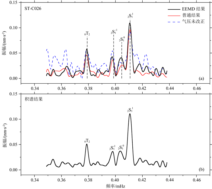 首先选取ST台站单台超导重力仪的观测记录,并利用它在两个频段上的气压导纳值,IMF-4 (0.4~0.8 mHz)为-3.550 nm·s-2·hPa-1和IMF-5 (0.2~0.4 mHz)为-3.989 nm·s-2·hPa-1,对重力残差信号进行气压改正.另外,作为比较我们还选择了单一的时域气压导纳值-2.763 nm·s-2·hPa-1 (即由原始重力残差在时域中计算得到的气压导纳值)直接对原始重力残差进行气压改正.图 11a给出了这两种方法在相应频段的检测结果.从图中我们可以看到基于EEMD方法进行的气压改正效果与普通方法相比,显著提高了2S1谱峰的分辨率,尤其m=0谱峰的信噪比明显得到提高,使我们可清楚地观测到2S1的3个分裂谱峰.未经气压改正的检测结果也在图中一并给出,该结果中m=0的谱峰基本看不到,再次说明了精细化气压改正的必要性.