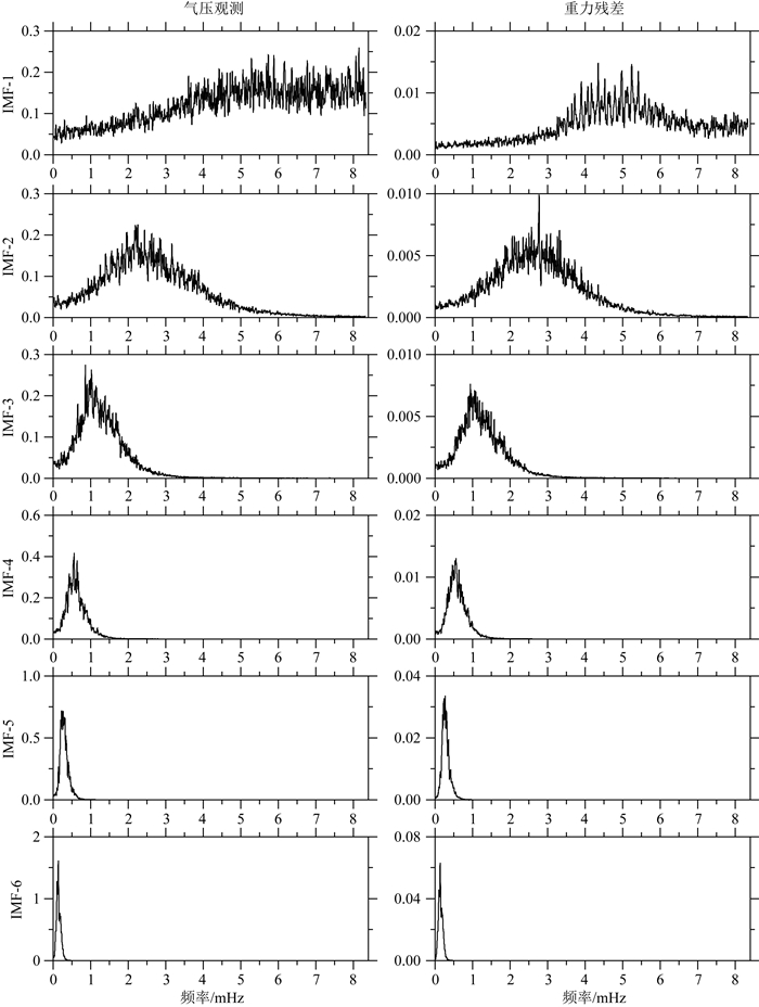 图 3 同步气压和重力残差经过EEMD分解以后得到的前6个IMF的振幅谱 气压的振幅单位为帕斯卡(Pa),重力残差的振幅单位为nm·s-2,所有振幅谱经过37个点的Parzen谱窗的平滑处理. Fig. 3 Amplitude spectra of first 6 IMFs of simultaneous atmospheric pressure and gravity residuals The unit of pressure′s amplitude is Pa and the gravity residual′s is nm·s-2. All amplitude spectra are smoothed by a 37-point Parzen spectral window. |