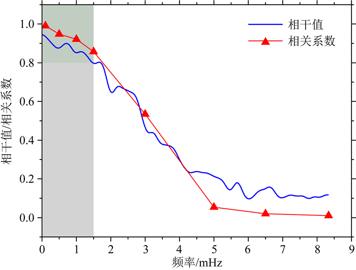 利用公式(2),对上述法国Strasbourg台站为期10天的重力残差序列和同步观测的气压变化做相干分析,结果由图 4给出.为了便于比较,图 4同时给出了两种信号处于不同频段的各IMF间的相关系数的绝对值.在不同频段做相关分析可以看作是相干分析在特定频率点的表述,从图 4中可以看到,相干分析的结果和各频段IMF间相关系数,在趋势上是一致的:在小于4 mHz范围内,两条曲线基本重合;特别在小于1.5 mHz的频段里,两种信号的相干值和相关系数的绝对值均大于0.8,说明在该频段重力残差受到了气压变化的强烈影响.通过比较两种相关分析方法的结果,验证了本文基于EEMD分解得到的两种信号的IMF间相关特性的正确性.