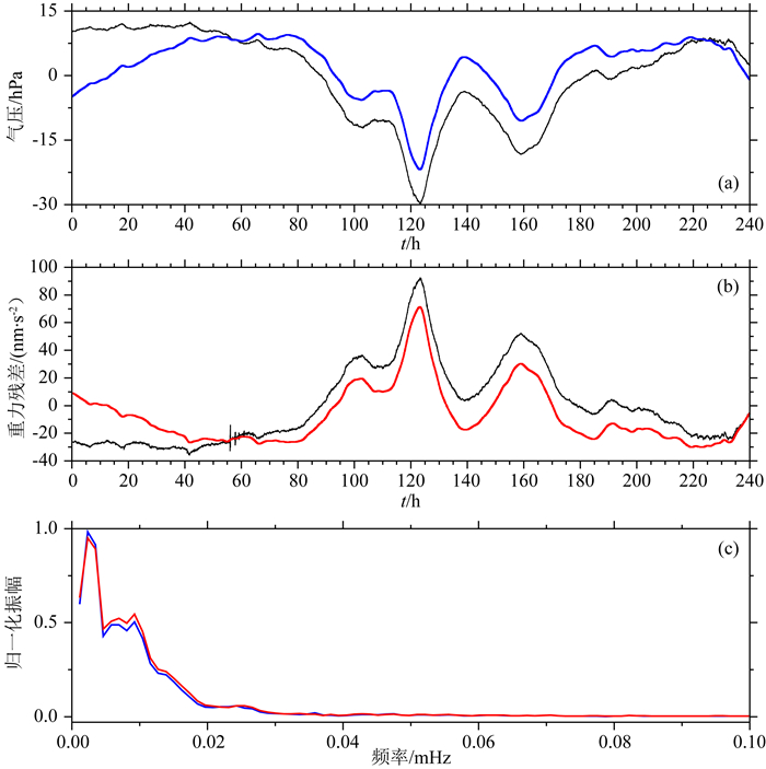 图 5 (a) 和(b)中黑色实线分别为气压观测和重力残差,蓝色实线和红色实线分别为气压变化和重力残差的IMF7到IMF12的和信号;(c)蓝色实线和红色实线分别为气压和重力残差的IMF-7到IMF-12和信号的归一化振幅谱 Fig. 5 (a) Atmospheric pressure during 10 days. The black line denotes original observations and the blue line denotes the sum signals from IMF-7 to IMF-12 of original pressure observations based on the EEMD; (b) Gravity residuals during 10 days. The black line denotes original observations and the blue line denotes the sum signals from IMF-7 to IMF-12 of gravity residual based on the EEMD; (c) Normalized amplitude spectrum of sum signals from IMF7 to IMF12. The blue line denotes atmospheric pressure and the red line denotes gravity residuals |