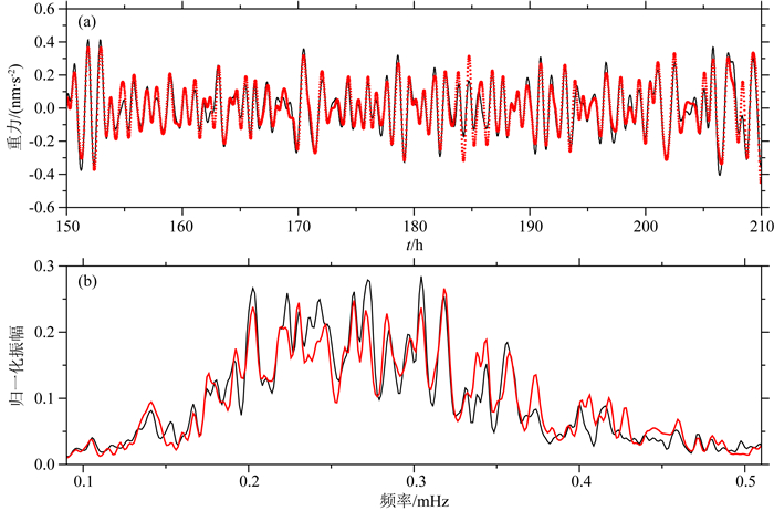 图 6 重力残差和气压观测的IMF-5之间的比较 (a)局部时间序列:红色虚线为气压变化,已乘上气压导纳值-3.989 nm·s-2·hPa-1转化为重力值,黑色实线为重力变化,两者的相关系数为-0.9213;(b)归一化振幅谱:红色和黑色实线分别表示气压和重力的归一化振幅谱,并均经过了11个点的Parzen谱窗的平滑处理. Fig. 6 Comparison of IMF-5 between gravity residuals and atmospheric pressure (a) Part of time series. The red dotted line denotes the atmospheric pressure multiplied by admittance -3.989 nm·s-2·hPa-1, the black solid line denotes the gravity residual and their correlation coefficient is -0.9213;(b) Normalized amplitude spectrum. The red solid line and the black solid line denote atmospheric pressure and gravity residual respectively and they are smoothed by an 11-point Parzen spectral window. |