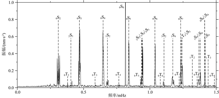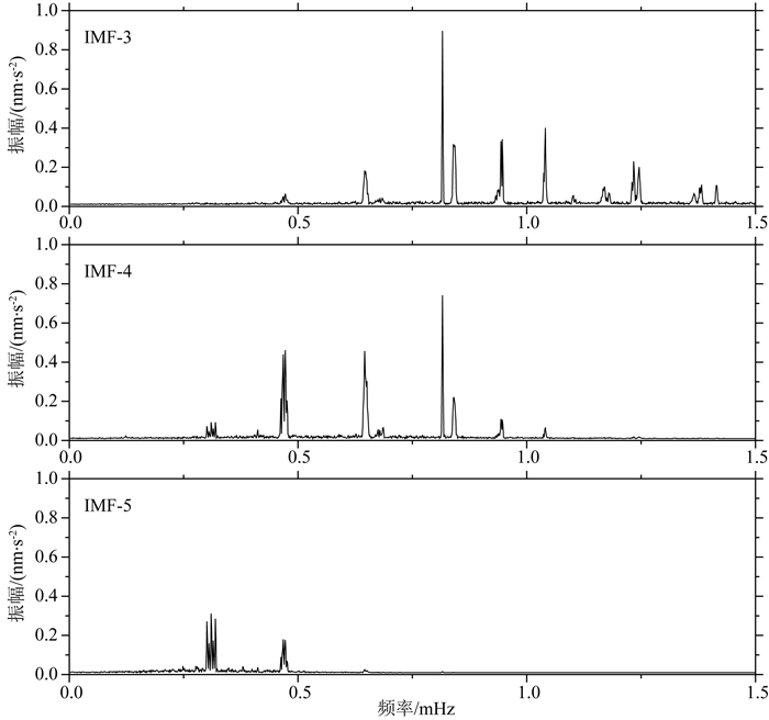 对震后去掉潮汐信号以后的重力残差记录和同步气压观测分别做EEMD分解,将信号分解到以上几个频段,然后利用各个频段上的气压导纳值分别进行气压改正.我们利用傅氏变换将去掉气压影响的每个IMF转化到频率域得到他们各自的振幅谱,图 7给出了IMF3到IMF5的振幅谱结果.结果显示将处于不同频率段上的简正模分解到了不同的IMF中,使我们可以单独利用一个IMF或几个IMF的组合来评估某一个简正模式.图 8给出了这三个IMF的和信号对应的振幅谱.可以看到,在低于1.5 mHz的频段上,除了检测到了所有的球型振荡以外,还清楚地检测到了多个环型振荡的耦合现象.