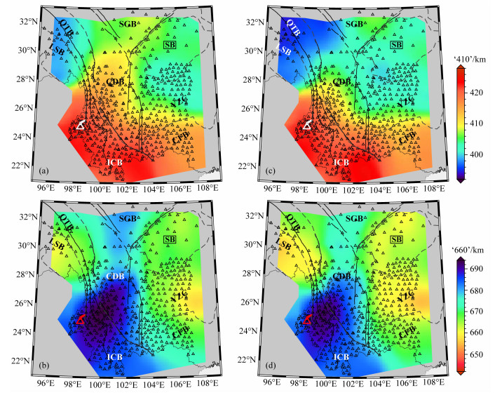 另一方面,研究区域内的‘660’普遍大于全球平均值.川滇菱形块体丽江断裂以南的滇中次级块体以及印支块体表现出明显的下沉.其中IASP91模型获得的‘660’起伏变化范围在653~696 km,平均深度约674 km(图 5b);校正速度模型后‘660’在649~698 km之间变化,均值约为671 km(图 5d).