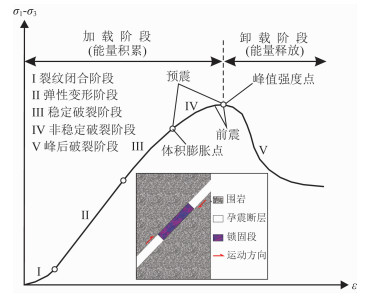 图 2 岩样或锁固段变形破坏过程示意图 Fig. 2 Schematic illustration of deformation and failure process of rock specimen or locked patch |