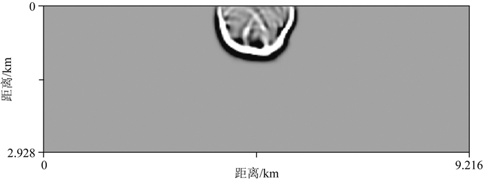 3 数值模拟 3.1 Biot双相介质弹性波方程在第一个数值试验中,我们选取一个单层介质模型,计算区域大小为0≤x≤10.0 km, 0≤z≤10.0 km.在区域设置(200×200)矩形网格,选取震源为纵波震源,设置震源位置为选取区域的中心位置(5.0 km, 5.0 km),选取震源函数为