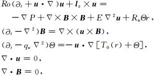 其中,Ω=Ωlz, Θ为温度扰动值,T0为CMB(核幔边界)温度.式中的无量纲参数(Ro为磁Rossby数,qк为磁Prandtl数)定义如下(本文第三部分表 1给出更加详细说明):