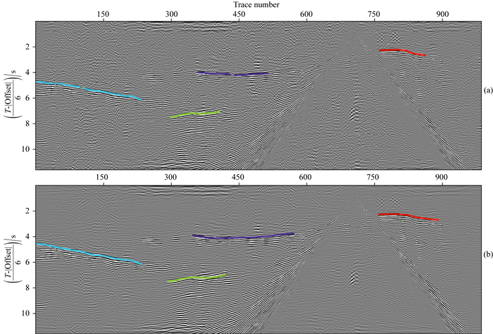 为了进一步验证本文去噪方法的效果,本节选取了在我国渤海海域采集的OBS数据进行去噪分析. 图 9、图 10所示为渤海海域某OBS数据,炮线长120 km,横轴为炮点号,纵轴为经过6 km·s-1速度折合后的时间.图 9a为经过原始解编、带通滤波、增益和反褶积等处理后的原始数据,图 9b为图 9a经过本文方法滤波后的结果,震相的连续性得到了增强,同时抑制了能量较弱的多次波,从而丰富了震相的信息.图 10所示为Pn震相(浅蓝)、PmP震相(绿)、Pg1震相(红)以及Pg2震相(深蓝)在常规处理后和曲波冷却阈值滤波后的拾取情况,比较图 10a和图 10b发现,经过本文方法处理后,Pn震相的连续性得到增强,同时另外三种震相的信息更为丰富,能够为后续速度结构反演提供更多有用信息.图 11所示为该数据的Curvelet谱,从图中能够看出,本文将该OBS数据分为5个尺度,且每个尺度水平方向上能量最强,这一点与OBS数据震相大多近似水平(折合后)的性质相吻合,经过多次迭代,谱中能量较弱的高频噪声得以压制,OBS数据达到去噪效果.