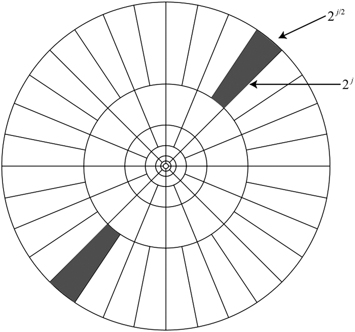 图 2 连续曲波空间频率域分块(Candès and Donoho, 2004) Fig. 2 Subdivision of the continuous Curvelet spatial frequency domain (Candès and Donoho, 2004) |