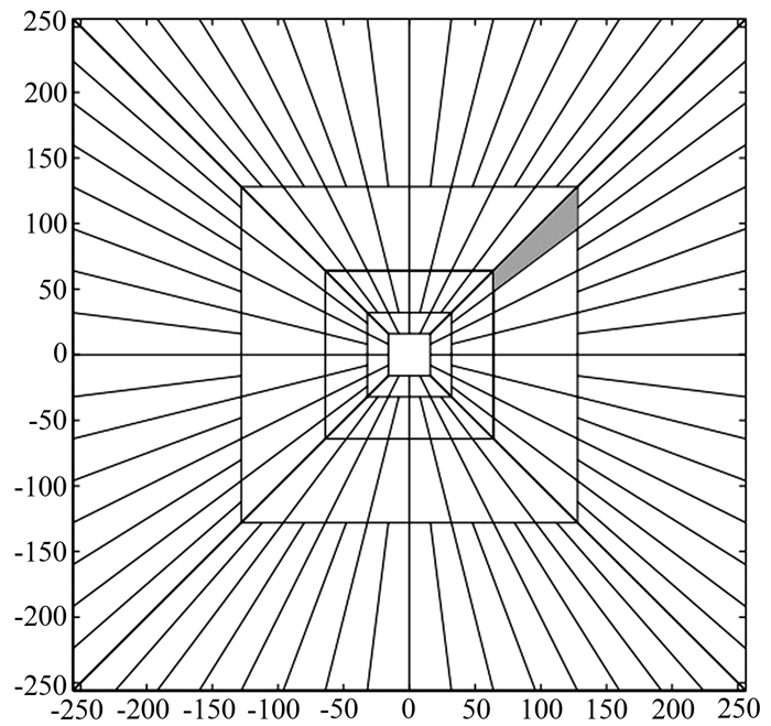 图 3 离散曲波变换频率域区域分块(Candès et al., 2006a) Fig. 3 Subdivision of the discrete Curvelet transform frequency domain (Candès et al., 2006a) |