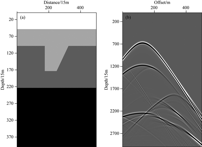 图 4 (a) 速度模型;(b)第126炮的地震记录 Fig. 4 (a) Velocity model of synthetic data; (b) Data of 126th shot |