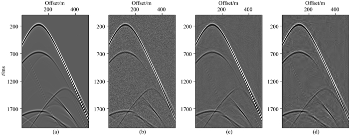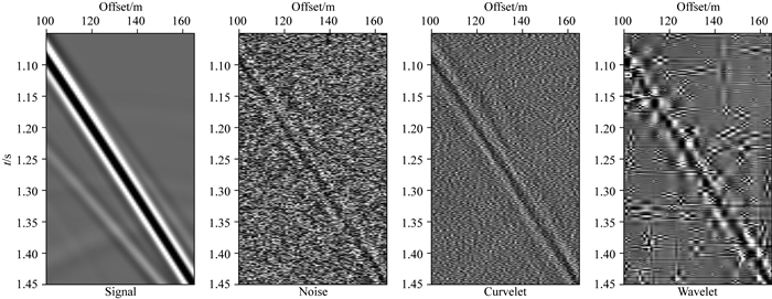 为了对比小波变换和曲波变换的抗噪性能,本文在模拟数据中添加高斯噪声(频率域为白噪特征,存在于整个频率域,不会影响信号在Curvelet域的稀疏性),使地震数据信噪比很小(小于0.1).这里定义信噪比为:
