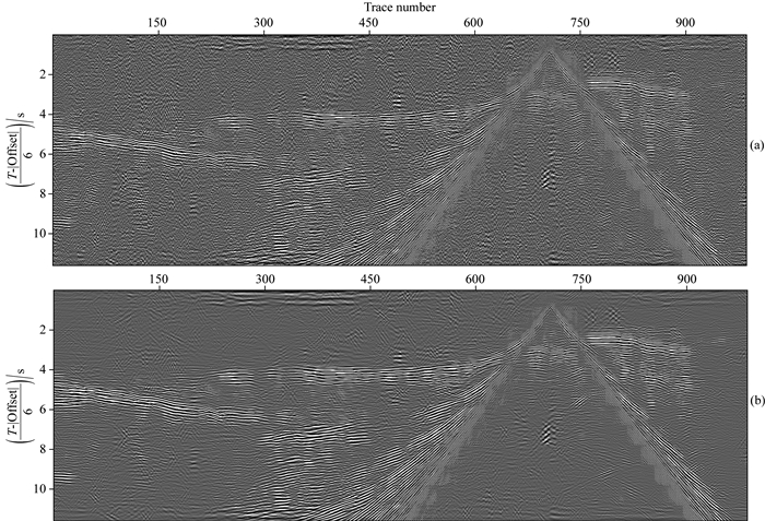 图 9 来自渤海OBS探测的实际数据 (a)经过常规处理的OBS数据;(b)经过Curvelet冷却阈值迭代去噪后的结果. Fig. 9 Real OBS data from Bohai Sea (a) OBS data after conventional processing; (b) Reconstructed data by Curvelet denoising. |