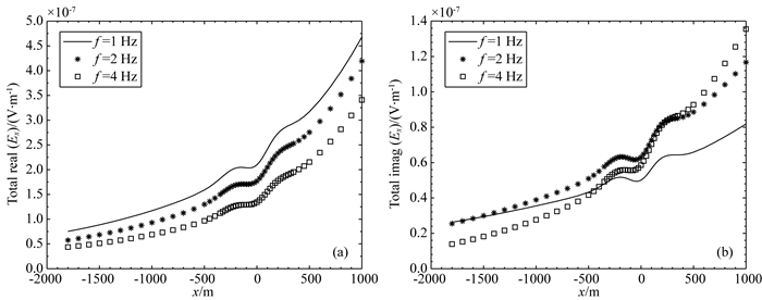 图 6 块状低阻体置于均匀半空间下的Esx二次场分量 (a)实部; (b)虚部. Fig. 6 Components of the secondary field Esx from a geoelectric model with a massive low-resistivity body in a uniform half-space (a) Real part; (b) Imaginary part. |