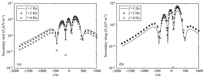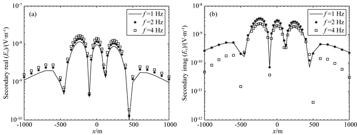 设计如图 10所示的组合异常体模型,异常体被置于电导率为0.01 S-1·m的均匀半空间中,图 10a中从左到右的异常体的电导率分别为0.001 S-1·m, 0.1 S-1·m, 0.002 S-1·m, 异常区尺度为600 m×200 m×400 m,x方向的坐标范围为:[-300 m, 300 m];y方向的坐标范围为:[-100 m, 100 m];z方向的坐标范围为:[200 m, 600 m].在x轴线以及y轴线上分别布设有限长导线源,源长为1000 m,源的坐标分别为(5000 m, 0 m, 0 m),(0 m,5000 m, 0 m),激发频率分别为1 Hz,2 Hz和4 Hz,激发电流为1 A,测量了主剖面y=0 m,共计算了53测点.图 11, 12分别表示源点坐标为(5000 m, 0 m, 0 m)激发时,电场Ex总场与二次场的实部与虚部曲线.由图 11可以看出,在异常体正上方曲线发生明显弯曲的变化,并在低阻异常体正上方曲线向下弯曲,体现了低阻异常体吸引电流的现象,而在高阻异常体的正上方曲线有明显向上凸的趋势,说明了高阻异常体具有排斥电流的现象.同时随着测点距离源越远,电场幅值逐渐衰减.而从纯二次电场Esx曲线(图 12)中可知,在异常区上方出现明显的三个极值点,极值点的位置区域能够很好地对应各异常体区的正上方.从图 12中可知,受场源的影响,在异常体电导率为0.002 S-1·m的正上方电场峰值明显要大于其他两个区域,这一现象与源点位于(0 m,5000 m, 0 m)激发产生的二次电场Esx的曲线存在明显的不同.图 13中可知,异常体区域同样出现明显的三个异常极值点,且可与异常体相对应,与图 12不同之处为异常体的电导率在0.001 S-1 · m得到的幅值最大,然后逐渐依次减小.