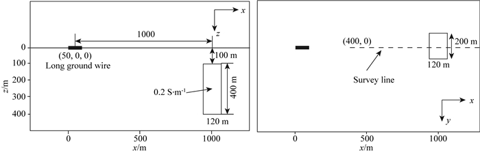 图 4 块状低阻异常体模型 Fig. 4 Massive model of low-resistivity anomalies. A 100 m grounded wire source is on the air-ground interface. The size of the conductive prism is 120 m×200 m×400 m in the x-, y-, and z-directions |
