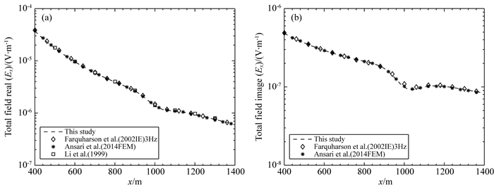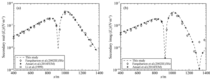 将本文的电场Ex分量的总场及二次场计算结果与采用六面体网格(512单元)的积分方程结果(Farquharson and Oldenburg, 2002)、非结构化有限元(713542单元)的结果(Ansari and Farquharson, 2014)和程序DCIP3D(Li and Oldenburg, 1999)的计算结果进行对比.图 5、6分别表示Ex分量的总场及二次场对比曲线.从图 5中可以看出,本文的结果与前人的结果高度吻合, 验证了本文算法的正确性.同样地,图 6二次电场结果可知,本文的结果与基于磁矢势的Helmholtz方程的有限元的结果具有高度吻合性,与Farquharson的积分方程结果存在一定误差,但误差相对较小,进一步验证本文算法的正确性.图 5的结果还可以了解到在异常体上方电场的实部与虚部存在下凹的现象,这说明异常体存在使得电流发生明显的变化,使得电流趋于低阻体方向流动,导致流经地表电流密度降低.