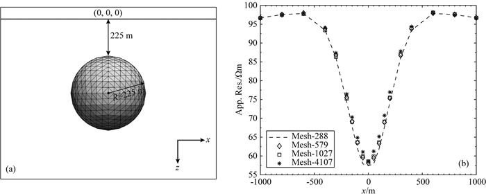 设置如图 7a所示的球状异常体模型分析本文算法收敛性情况.球体的半径为225 m,球体的中心位置为(0 m, 0 m, 450 m).沿x方向放置长接地导线,导线长度为1 km,发射电流为1 A,源的中心坐标为(0 m, 6000 m, 0 m).以坐标原点为中心,沿着x轴布设19个测点,测点x方向的坐标范围为(-1000~1000 m),y与z等于0 m.发射频率为16 Hz.球状异常体被置于均匀半空间中,电导率为1 S·m-1,背景电导率为0.01 S·m-1. 图 7b展示了不同异常体单元剖分数视电阻率曲线变化图.从图 7b结果中可知,视电阻率曲线能够较明显体现低阻异常响应,同时随着网格数的增加,视电阻率值未发现明显的变化,说明了本文编制的3D CSEM程序收敛且正确.